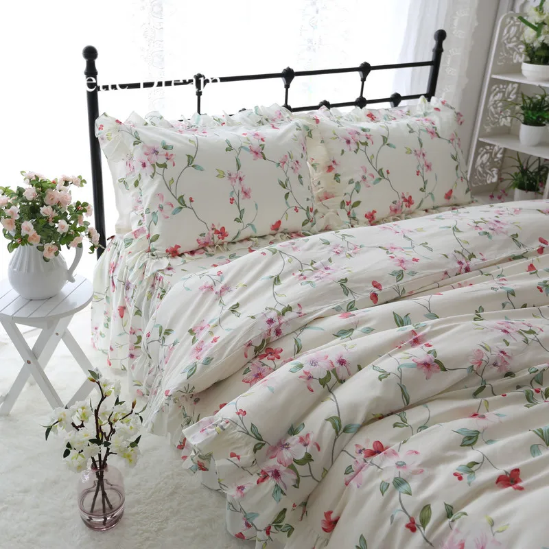 Discount Princess style bedding set garden print ruffle duvet cover set 100% cotton bed sheet set home texti